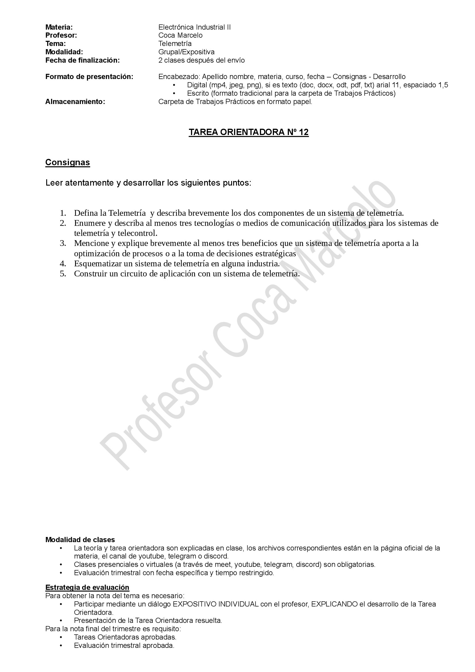 Se trata de una materia que aborda control de actuadores y la automatización en procesos industriales. Pertenece al 6to año de la especialidad Técnico en Electrónica. Aquí encontrarás el programa de contenidos, las tareas orientadoras a desarrollar durante el presente año lectivo. También la teoría para resolver las tareas mencionadas, el acuerdo pedagógico y los criterios de evaluación. Para una mejor comunicación sugiero unirte al grupo del curso en el servidor de discord o telegram, para ello me debes enviar un mensaje privado con tu apellido nombre y curso para que te agregue al grupo correspondiente.